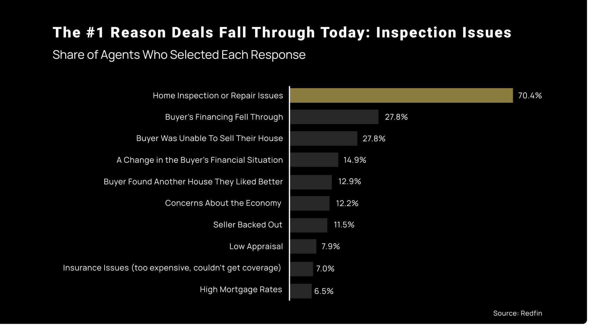 You might assume the main reason buyers are backing out today is financing. But that’s actually not the case. The most common deal breaker today, by far, is inspection and repair issues (see graph below):