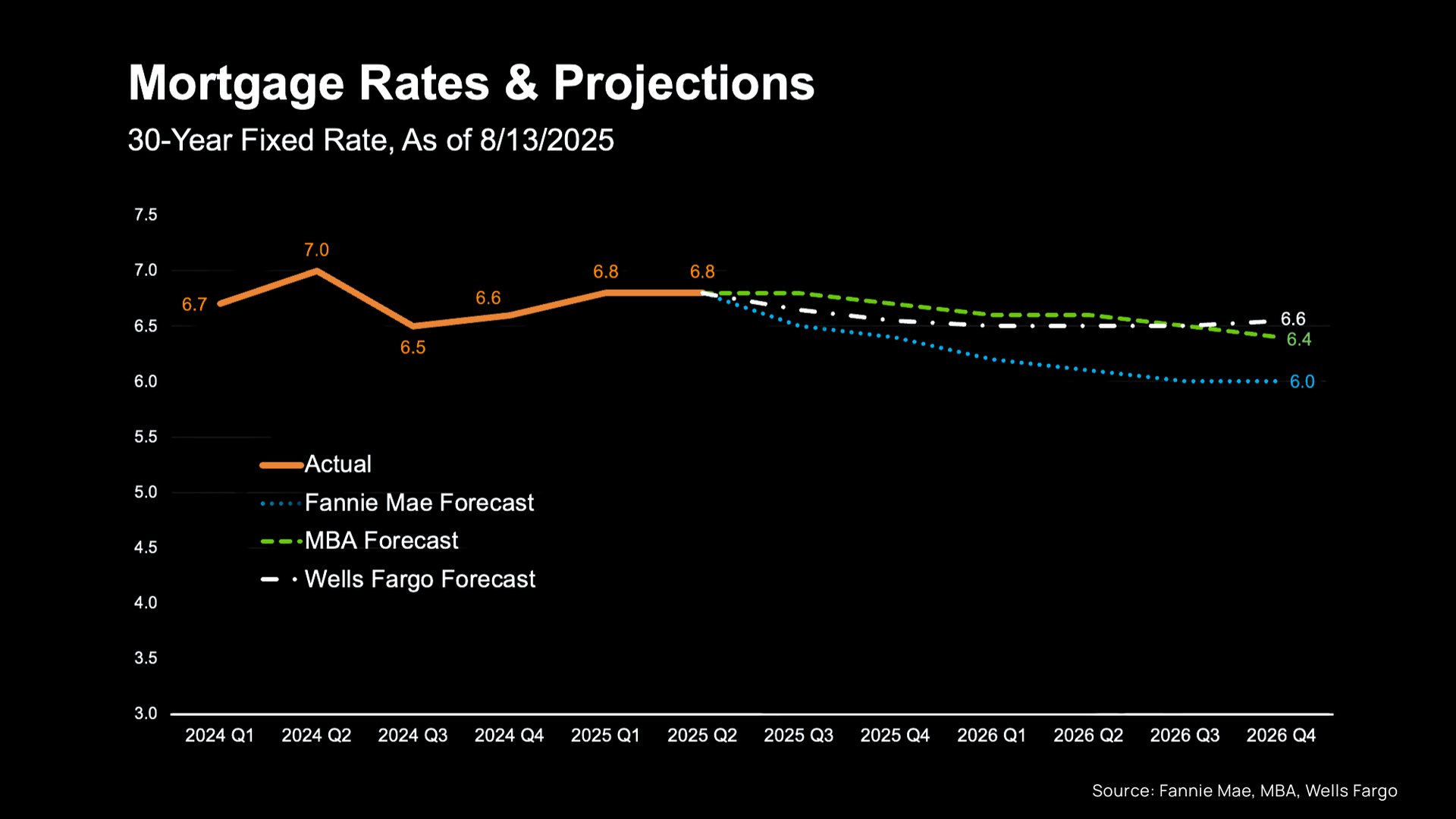 According to the latest forecasts, rates aren’t expected to fall dramatically anytime soon. Most experts project they’ll stay somewhere in the mid-to-low 6% range through 2026 (see graph below):