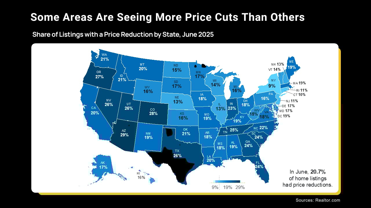 While the number of price cuts is up nationally, data shows some parts of the country are seeing far more of them than others. It all comes down to how much inventory has grown in that area (see map below):