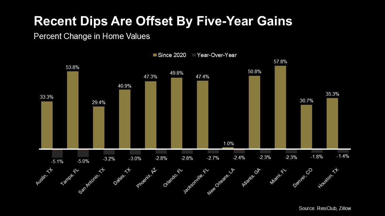 And when you look at the graph below, it’s clear that prices in most of those markets are up significantly compared to where they were five years ago (the blue bars). So, those homeowners are still ahead if they’ve been in their house for a few years or more (see graph below):