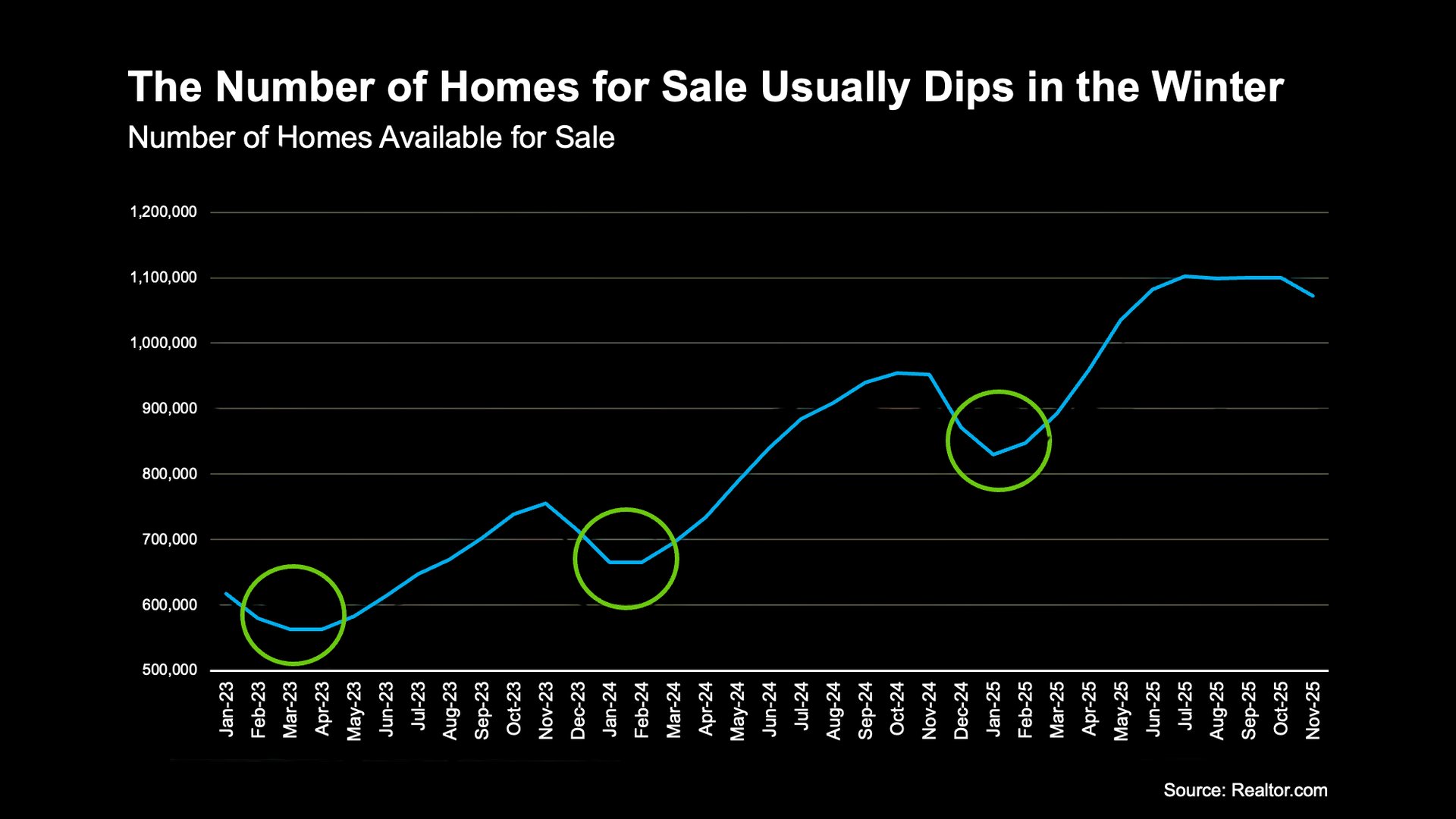 History shows the number of homes for sale tends to drop during the winter months. It’s a trend that’s predictable almost every year.
