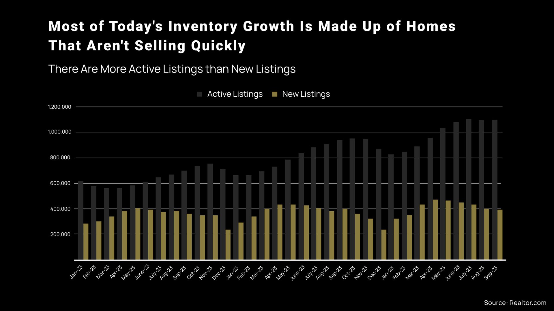 Data from Realtor.com shows most of the inventory growth lately is actually from active listings that are staying on the market and taking longer to sell (see the graph below).