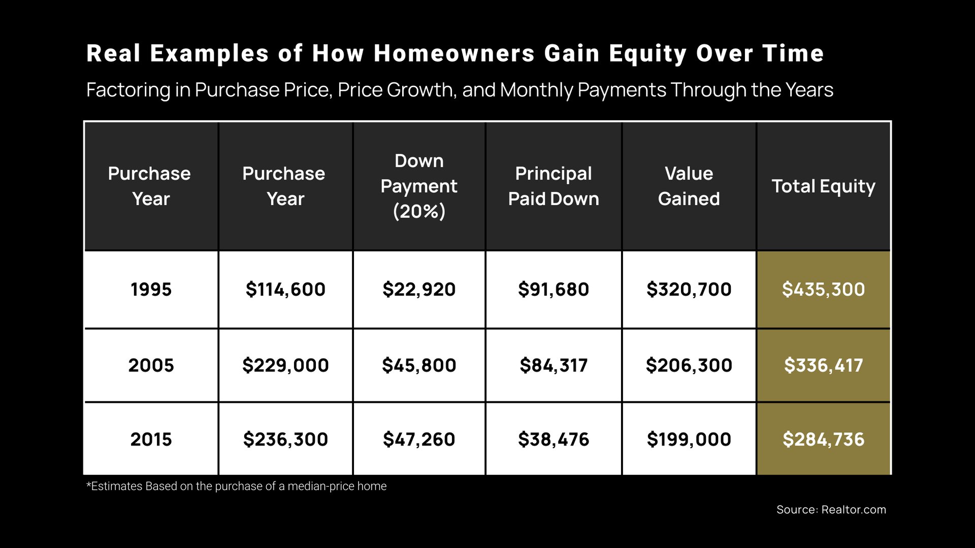 This chart uses research coming out of Realtor.com to show an estimate of how much equity homeowners have built up depending on when they bought. For each time frame, it takes the median-priced home and uses it as the baseline example. The numbers are shocking, too. According to the study, if you bought the average-priced home in...